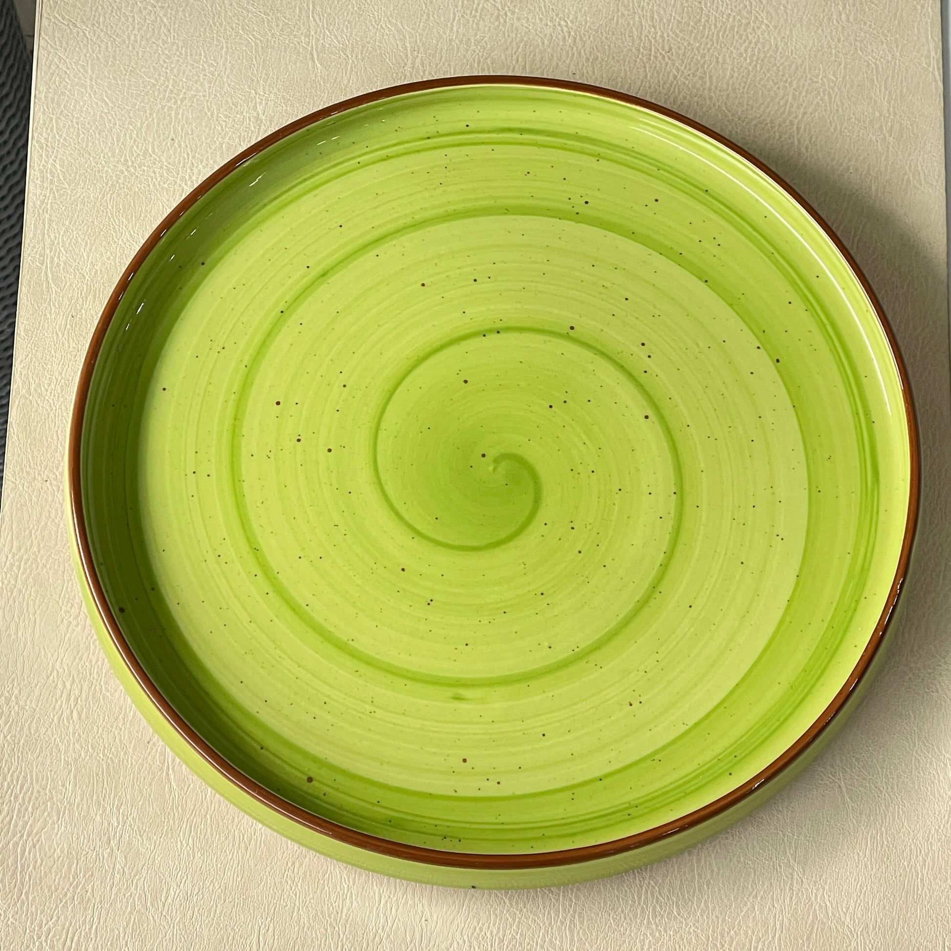 This 10 inch Classic Plate in lime green colorline with brown line and brown specks is a versatile addition to any dinnerware collection. Handmade with high-quality ceramic material, it can be used as a dinner plate or a stylish serving plate. Add a touch of elegance to your table with this unique and functional piece.