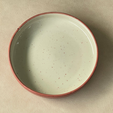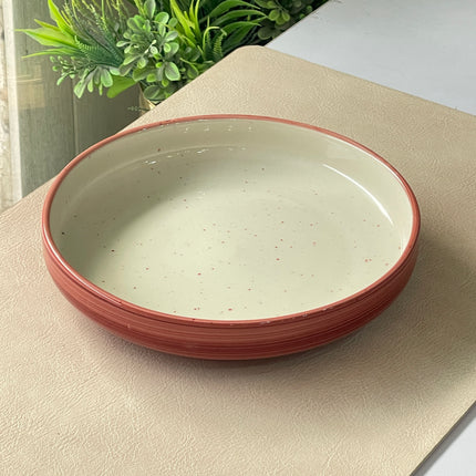 Expertly crafted and uniquely designed, our 8 inch Deep Classic Plate ( Outer Maroon Colorline with maroon specks ) adds a touch of elegance to any table setting. Made from high-quality ceramic, this handmade plate features a rich ( Outer Maroon Colorline with maroon specks ) making it a perfect choice for both everyday use and special occasions