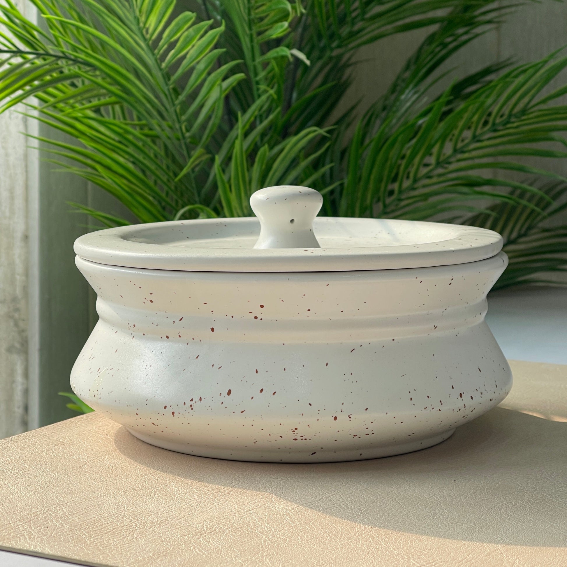 Expertly crafted in white matte color with brown specks, this 8" Handi is the ideal size for serving satisfying family meals. Made from durable ceramic material, it offers both style and functionality for your kitchen. Elevate your dining experience with this must-have cooking essential.