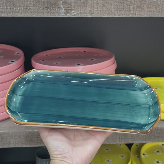Our 11.5"x6" YM Rectangular Platter in Peacock Green Colorline with brown line is the perfect addition to your dining table. Made of high-quality ceramic material, each platter is handmade.. Its large size of 11.5"x 6" provides ample space for serving dishes, making it a practical and stylish choice for any gathering.