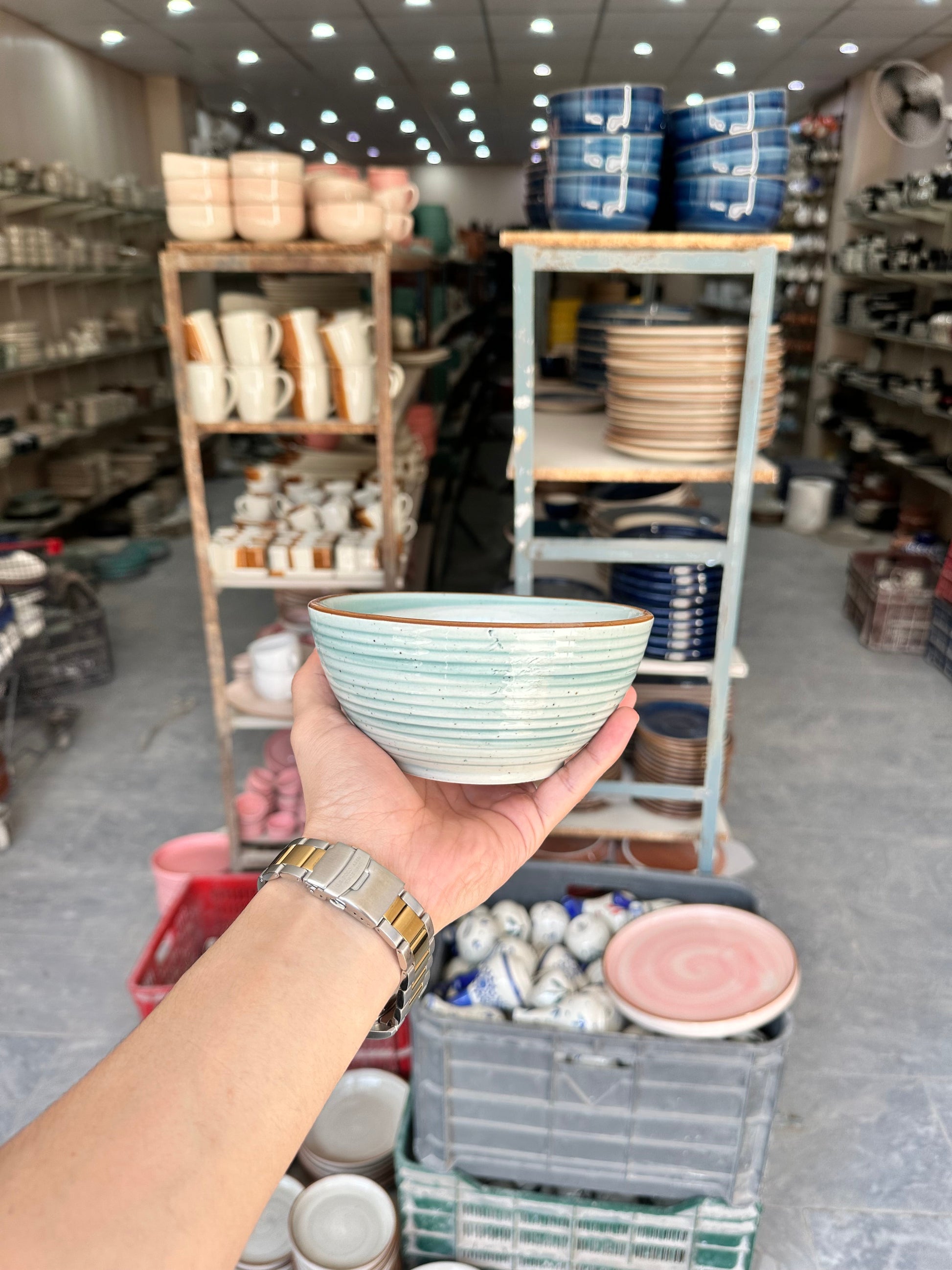 This 5.5" circular bowl in Teal Colorline Brown line on border and it is the perfect addition to your kitchenware. Made from high-quality ceramic material, it is expertly crafted by hand. Use it for rice, cereal, or noodles and elevate your dining experience. Practical and elegant, this bowl is a must-have for any household.