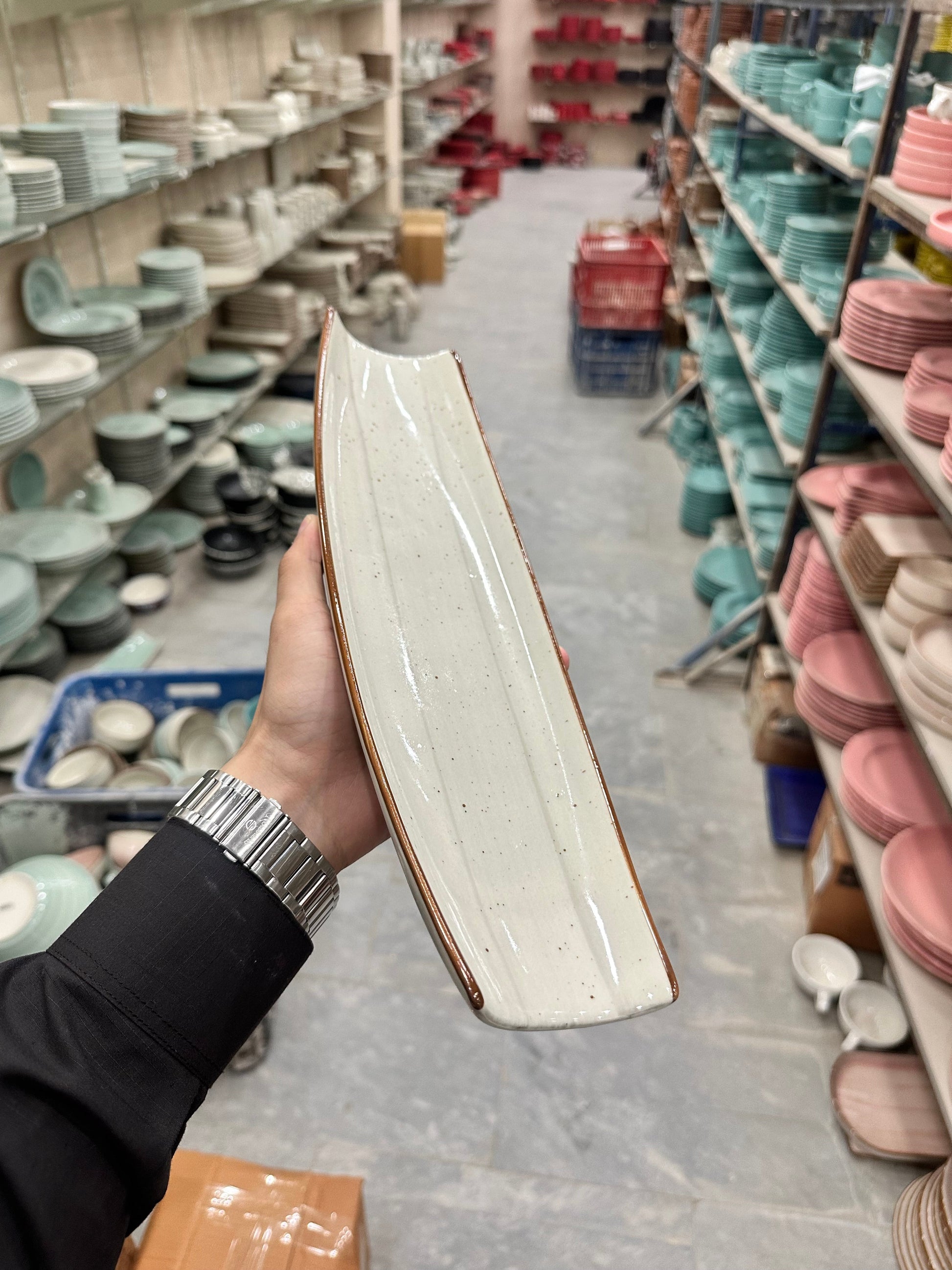 This leftover curved sushi platter in grey colorline with a brown border is not only a beautiful addition to your dinnerware collection, but it is also handmade with ceramic material for durability. With a size of 14"x4", it provides ample space for your sushi creations. Elevate your dining experience with this unique and functional platter.